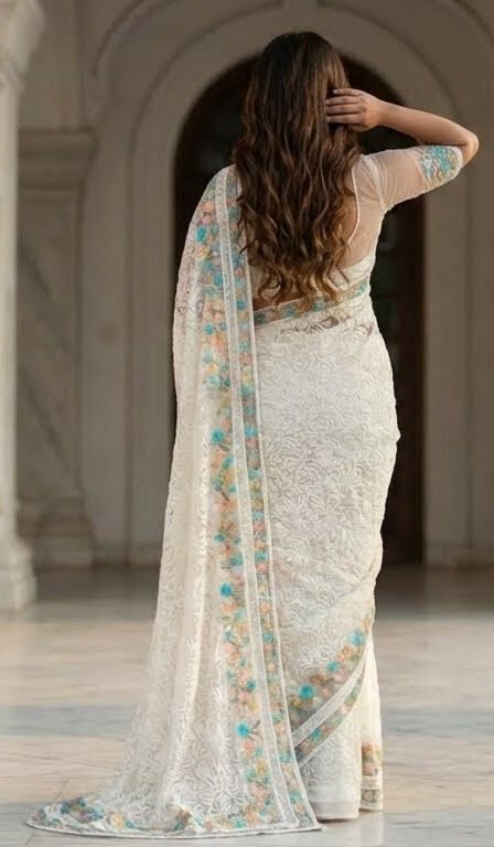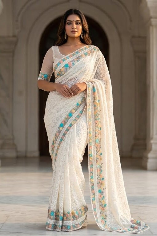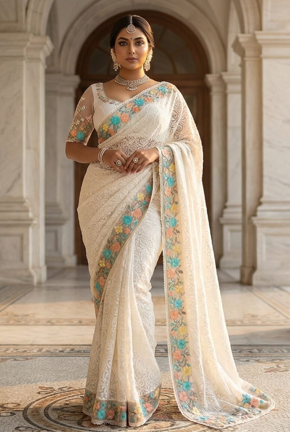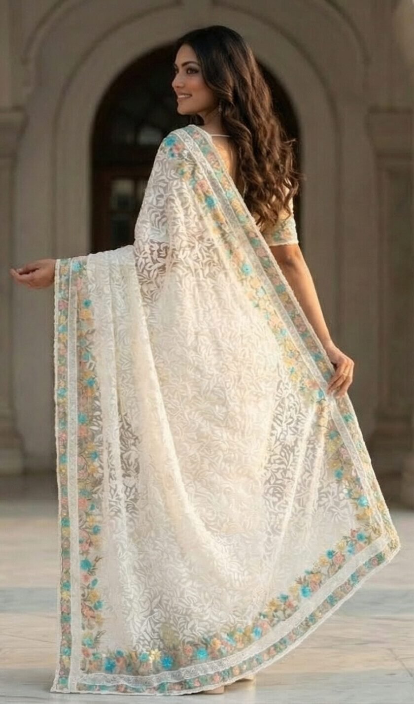 Discover the perfect harmony of two premium fabrics with this Ivory Georgette-Muslin Fusion Saree. The pristine off-white base is crafted to offer the flowy grace of Georgette combined with the sheer, lightweight luxury of Muslin. The entire body is adorned with subtle, self-colored (tone-on-tone) embroidery that adds a rich texture. The highlight of the saree is its vibrant, multi-colored floral border, featuring intricate thread work in shades of teal, orange, and peach. It is paired with a matching blouse that has beautifully embroidered sheer sleeves. This saree is a timeless choice for daytime weddings, Nikah ceremonies, or sophisticated evening gatherings.