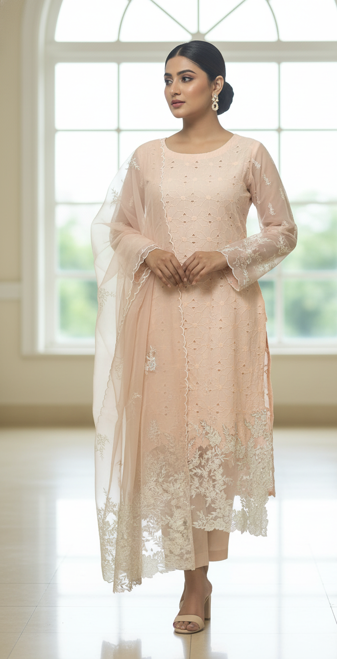 Elevate your wardrobe with our premium cotton kameez, featuring intricate all-over Chikankari-style embroidery. Designed in a delicate soft peach tone, this outfit perfectly combines tradition and sophistication for any occasion. The breathable cotton fabric ensures unmatched comfort, allowing you to feel at ease while looking effortlessly graceful.