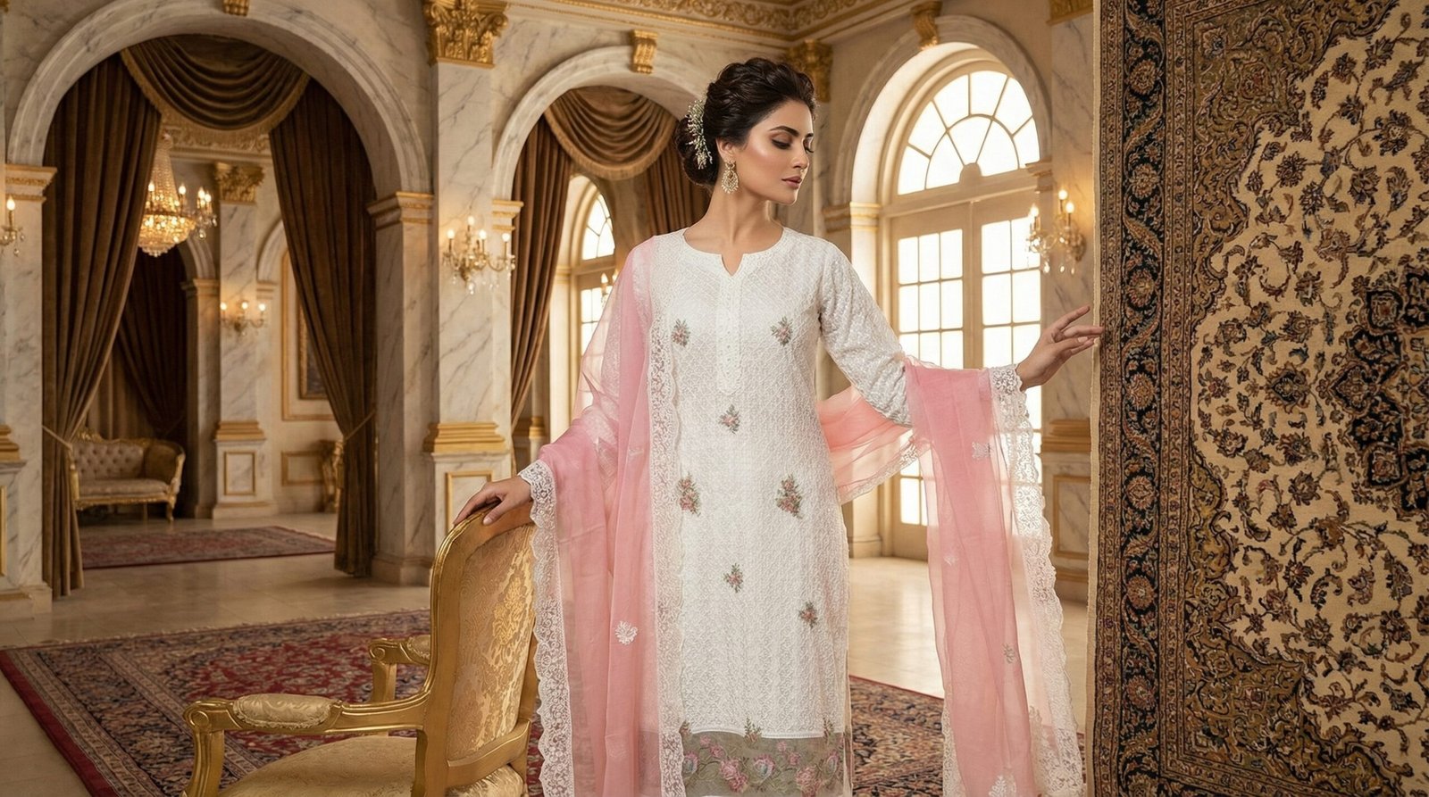 This is a premium 3-piece designer boutique set, exuding elegance and grace. The kameez is crafted from pristine white Chikankari fabric, featuring intricate white-on-white all-over eyelet embroidery. It is accented with delicate pink floral motifs on the body and a sophisticated taupe/grey embroidered border at the hem. The true highlight is the ethereal sheer Muslin dupatta in a soft baby pink shade, adorned with heavy white floral embroidery and exquisite scalloped lace edges. Completed with tailored white trousers, this ensemble is a timeless choice for Eid, formal lunches, or high-end festive celebrations.