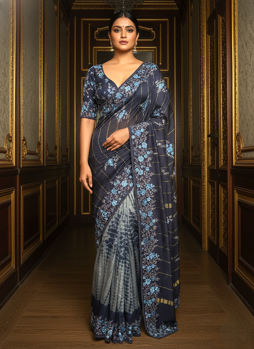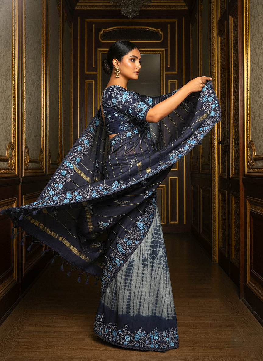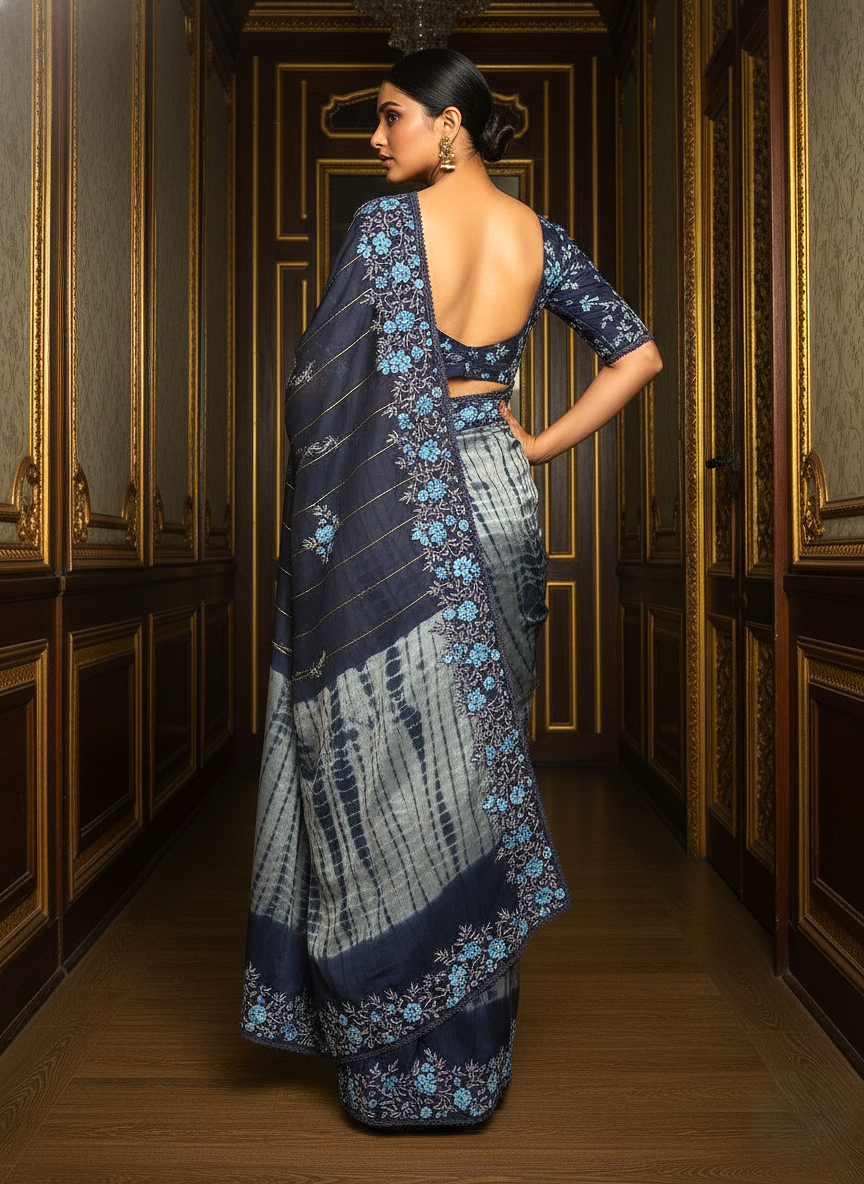 | Work | Shibori Tie-Dye Pleats, Zari Stripes & Floral Thread-work |